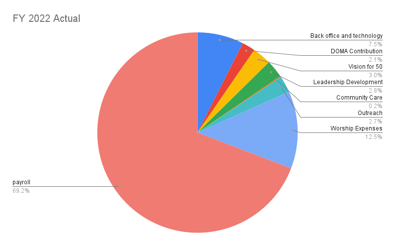 The previous fiscal year extended from September 2021 through August 2022. As a result, the above categories do not reflect the fundraising that Fr. Ryan has done for the Curacy position. We exceeded our projected income in all three areas: personal support raising, the members/attenders, and grants. One encouragement is that whereas in 2021, our three streams of income were nearer to 30% each, the percentage of grant money has decreased, which means that we had major increases both in giving from support raising and from regular attenders and members. We would ideally like the number of grants we receive to taper down and this is an encouraging trend.