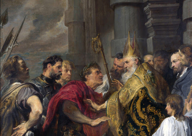 Saint Ambrose barring Emperor Theodosius from Milan Cathedral in 390 A.D. A painting by Anthony van Dyck (Wikipedia).